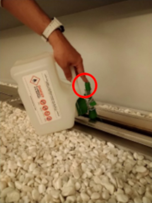 ③暖炉の蓋を開けて、タンクに入れたエタノールを暖炉に注ぎます。注ぎきれない場合は、赤〇印のプッシュボタンを押してください