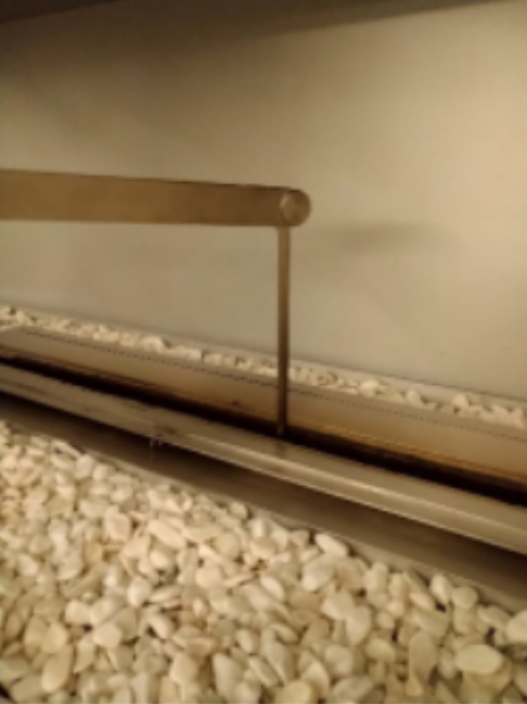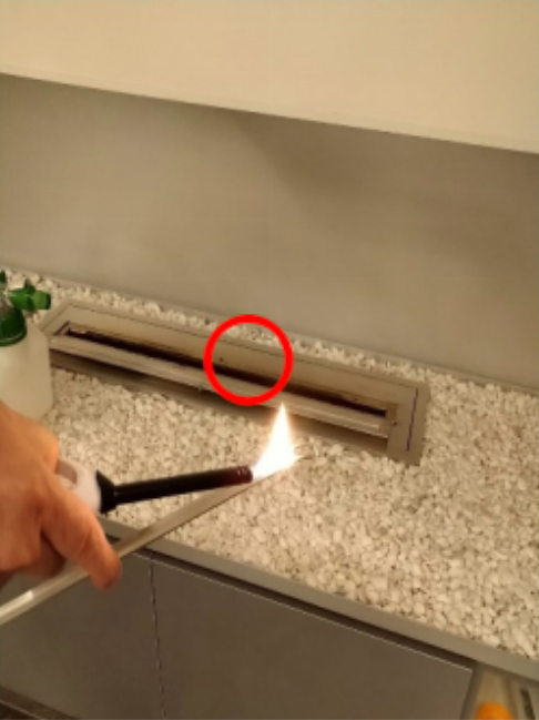 ⑤ステンレスフックの先に付着したエタノールにチャッカマンを使用して点火し、それを暖炉の赤〇印に近づけると暖炉が付きます